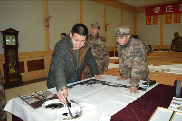 2014年1月17日枣庄市群艺术馆组织多位著名书画家至我市某部军营进行“迎新春书画慰问活动”,为部队官兵带来了文化工作者的节日问候,丰富了部队官兵的业余文化生活,同时也提高了军营中书画爱好者的艺术创作水平。